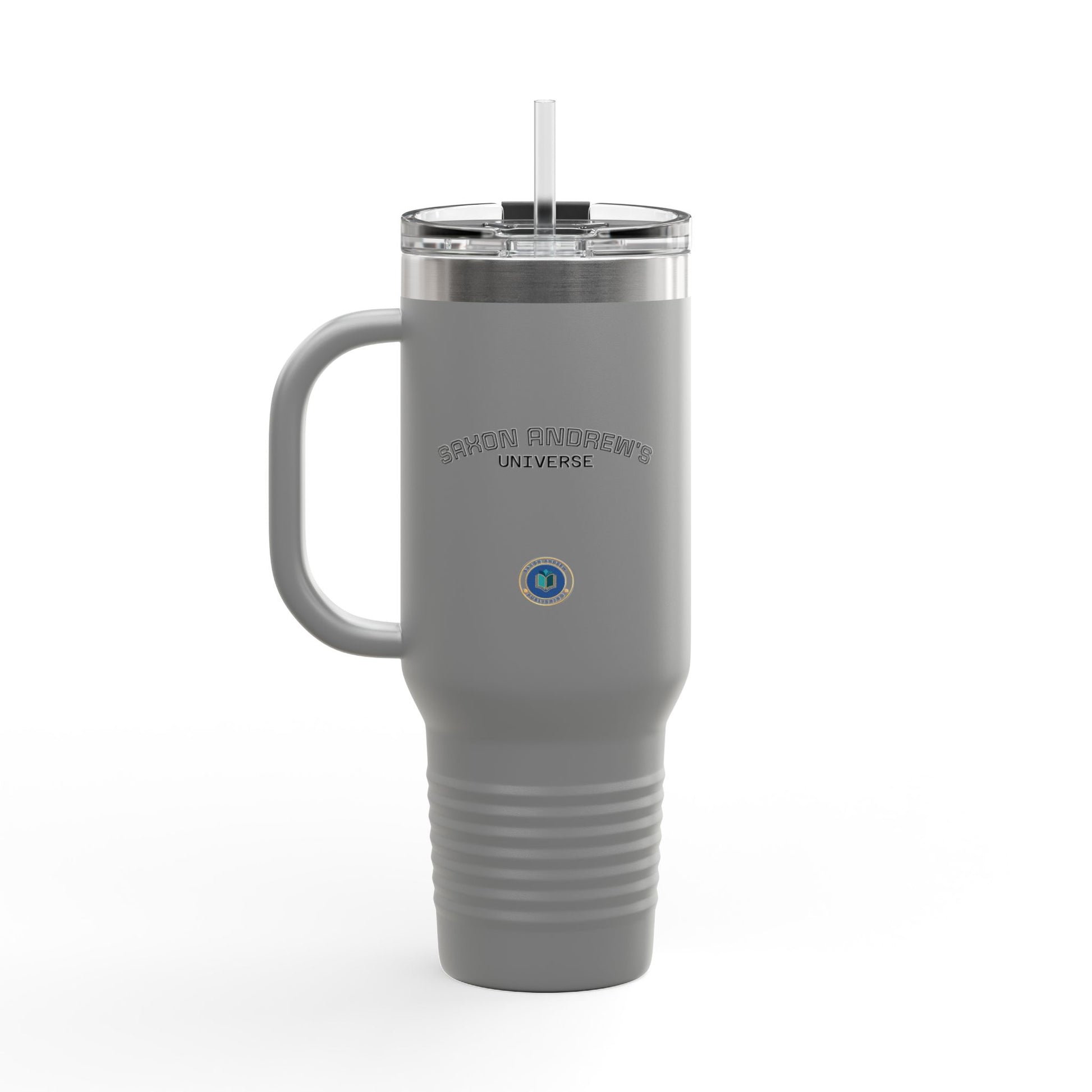 Saxon Andrew's Universe presents: Surviving the Fall: K Stands for Killer - THE TRAVEL MUG! 40oz capacity for extended use. Double-wall stainless steel insulation. Ergonomic handle with included straw and leak-resistant lid. Durable powder-coated finish with UV-DTF printed design. BPA-free; hand wash recommended.